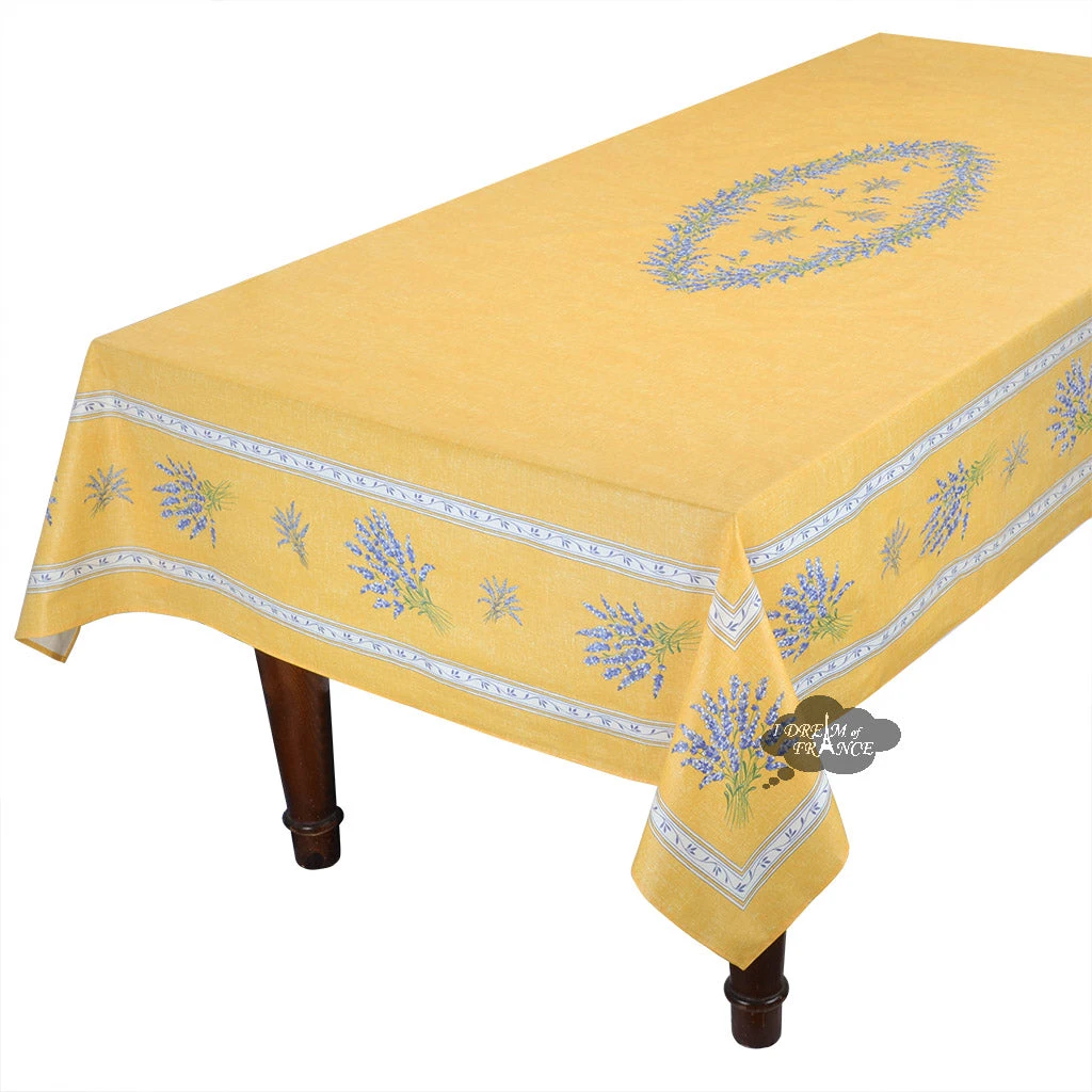 From Provence, this Valensole coated tablecloth features Lavender bouquets on a golden yellow background. It is 100% cotton coated with acrylic to make it stain resistant and long lasting. Spills will not go through, protecting your table. Cleanup is as easy as wiping it with a sponge. UV resistant, they resist fading and are perfect inside or outside.