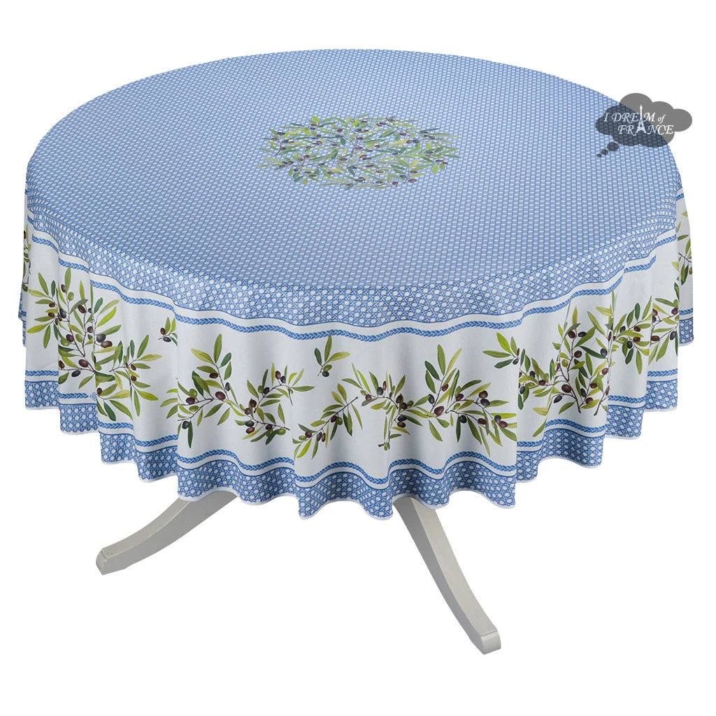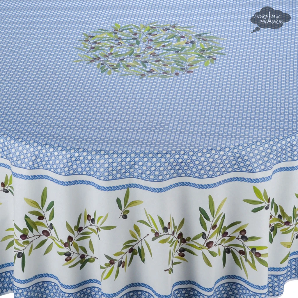 From Tissus Toselli, this coated tablecloth is named after the picturesque town of Nyons in the heart of Provence. It features a bright and cheerful olives motif on a blue and white background with a woven cane rattan pattern. It is 100% cotton coated with acrylic to make it stain resistant and long lasting. Spills will not go through, protecting your table. Cleanup is as easy as wiping it with a sponge. UV resistant, they resist fading and are perfect inside or outside.