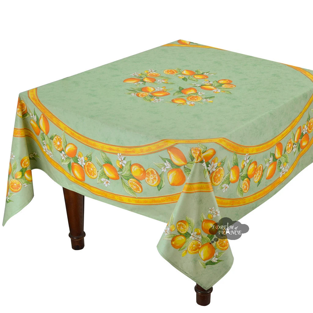 70″ Square Lemons Green Acrylic-Coated Cotton Tablecloth By Tissus Toselli Table Linens