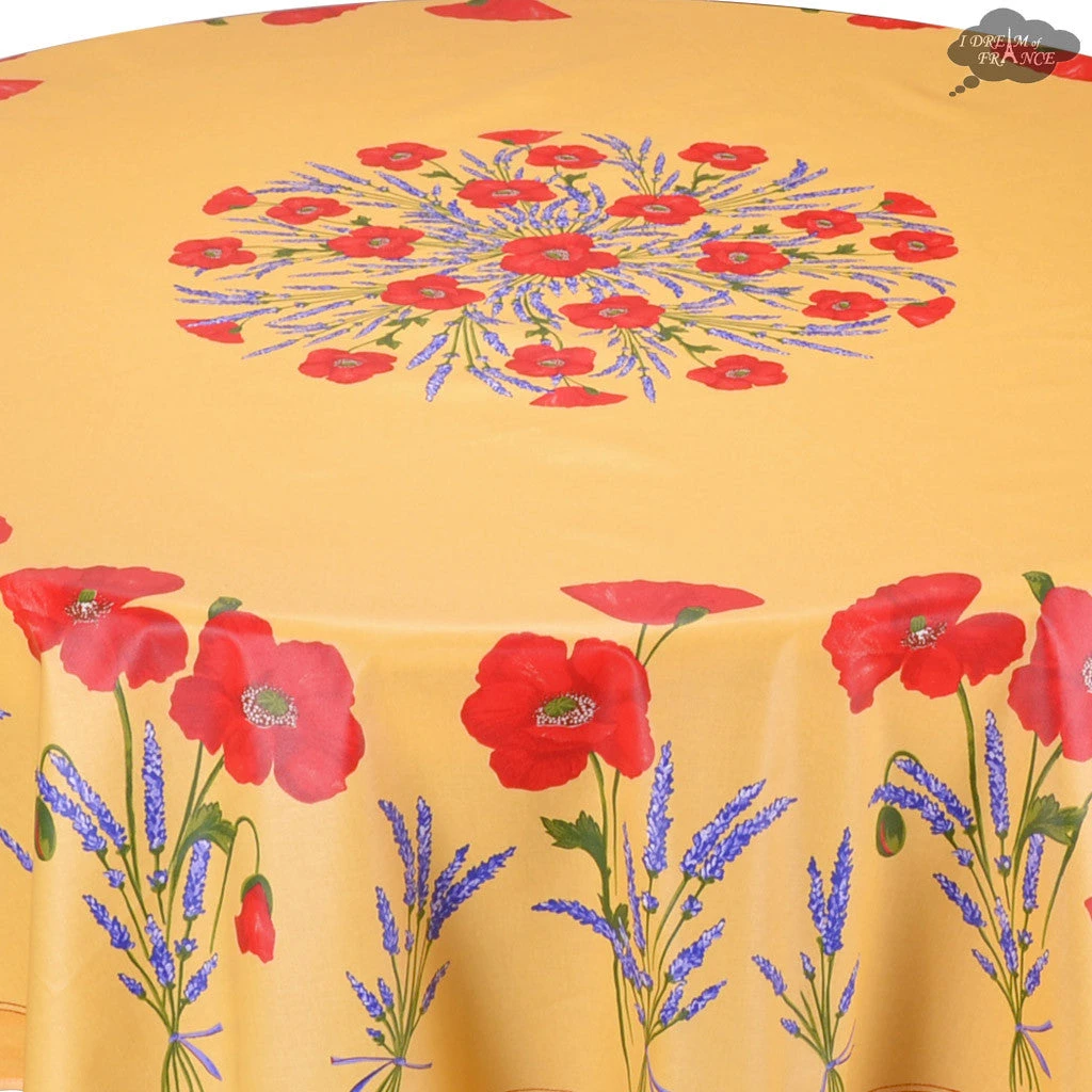 90″ Round Poppies Yellow Acrylic-Coated Cotton Tablecloth By Tissus Toselli