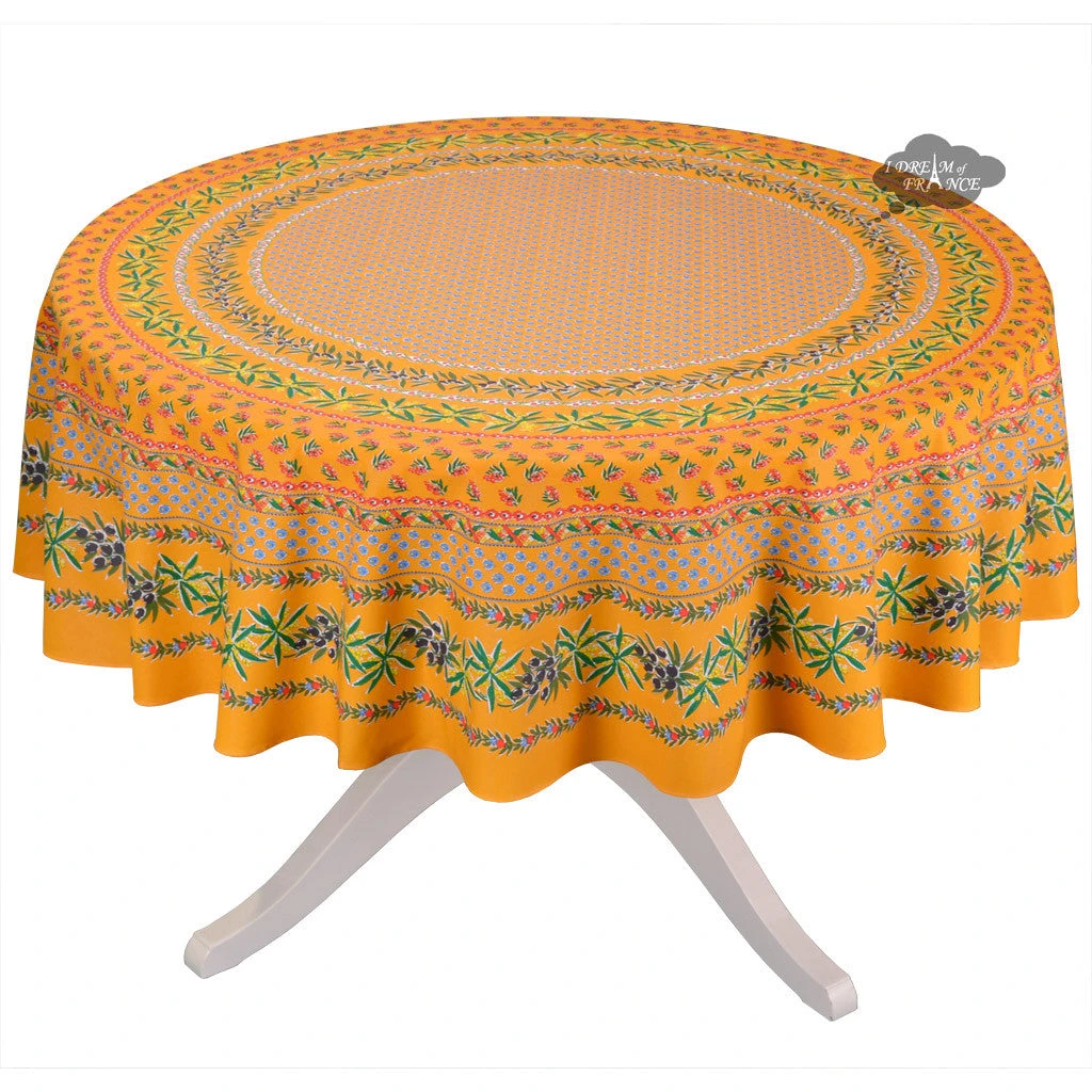 From Le Cluny French Country Collection, this coated tablecloth will transport your table to Provence. It features olives and mimosas on a mustard yellow background. It is 100% cotton and is available with or without stain resistant coating. With the acrylic coating, spills will not go through, protecting your table. Cleanup is as easy as wiping it with a sponge. UV resistant, they will not fade and are perfect inside or outside. This tablecloth measures 70″ in diameter, it will fit most round tables up to about 52 inches in diameter. Made in France. It can be ordered with an umbrella hole, please see options below.