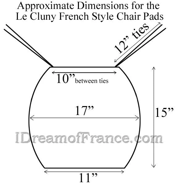 From Le Cluny French Country Collection, these coated chair pads will coordinate with our Olives red tablecloth or placemats. They are reversible and 100% cotton coated with acrylic to make them stain resistant. Their shape is perfect for French country chairs with a narrow back. Please see the diagram with the approximate dimensions to make sure they will fit your chairs.