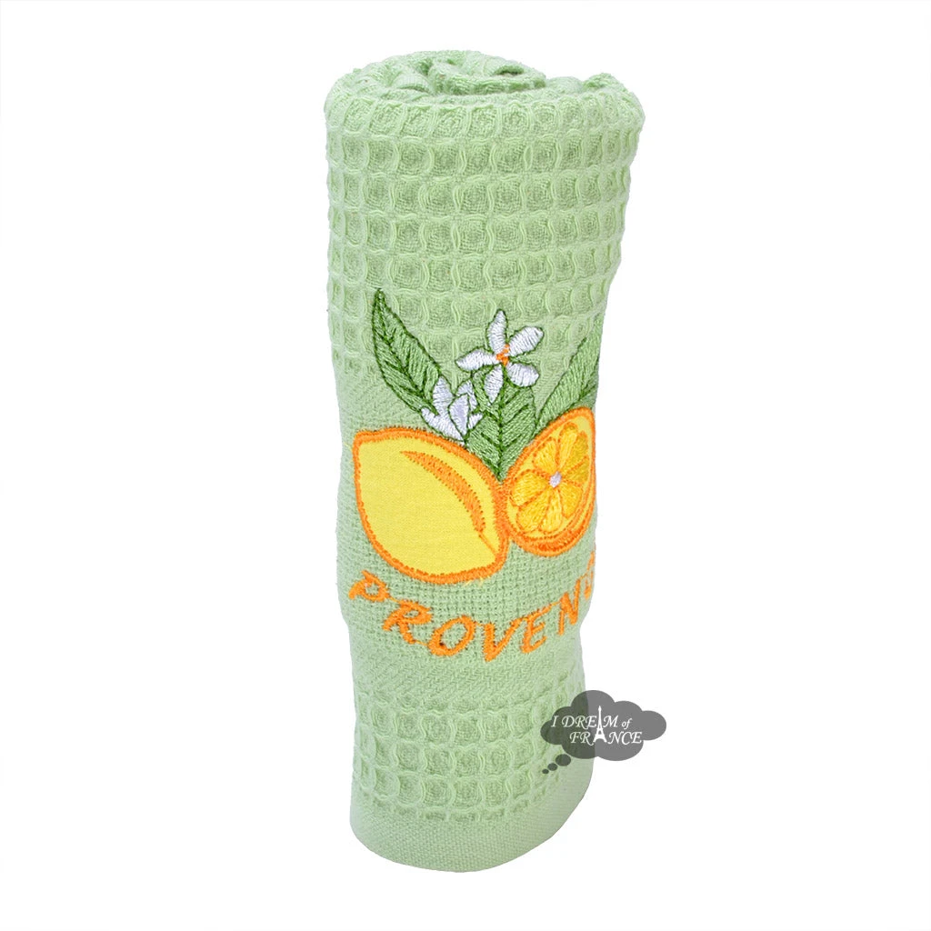 Direct from Provence, this beautiful towel will be a great addition to your kitchen. Made of 100% cotton, this towel will handle the toughest jobs thanks to its waffle-weave texture. This light green towel is embroidered with lemons and the word “Provence.” It comes rolled as on the picture, perfect for offering as a gift.