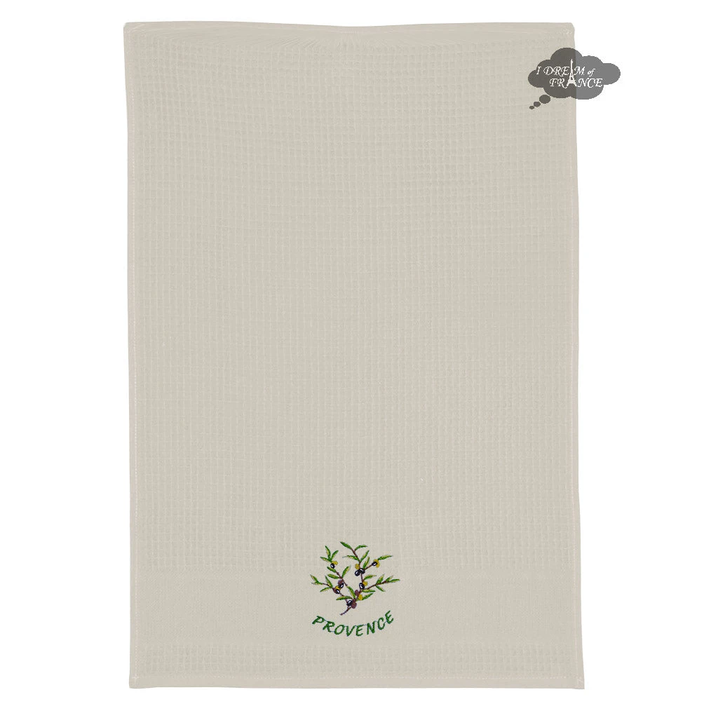 Direct from Provence, this beautiful towel will be a great addition to your kitchen. Made of 100% cotton, this towel will handle the toughest jobs thanks to its waffle-weave texture. This cream towel is embroidered with an olive branch and the word ‘Provence’. It comes rolled as on the picture, perfect for offering as a gift. The motif is embroidered at the bottom center of the towel. Measures 20×28″. Made in Turkey.