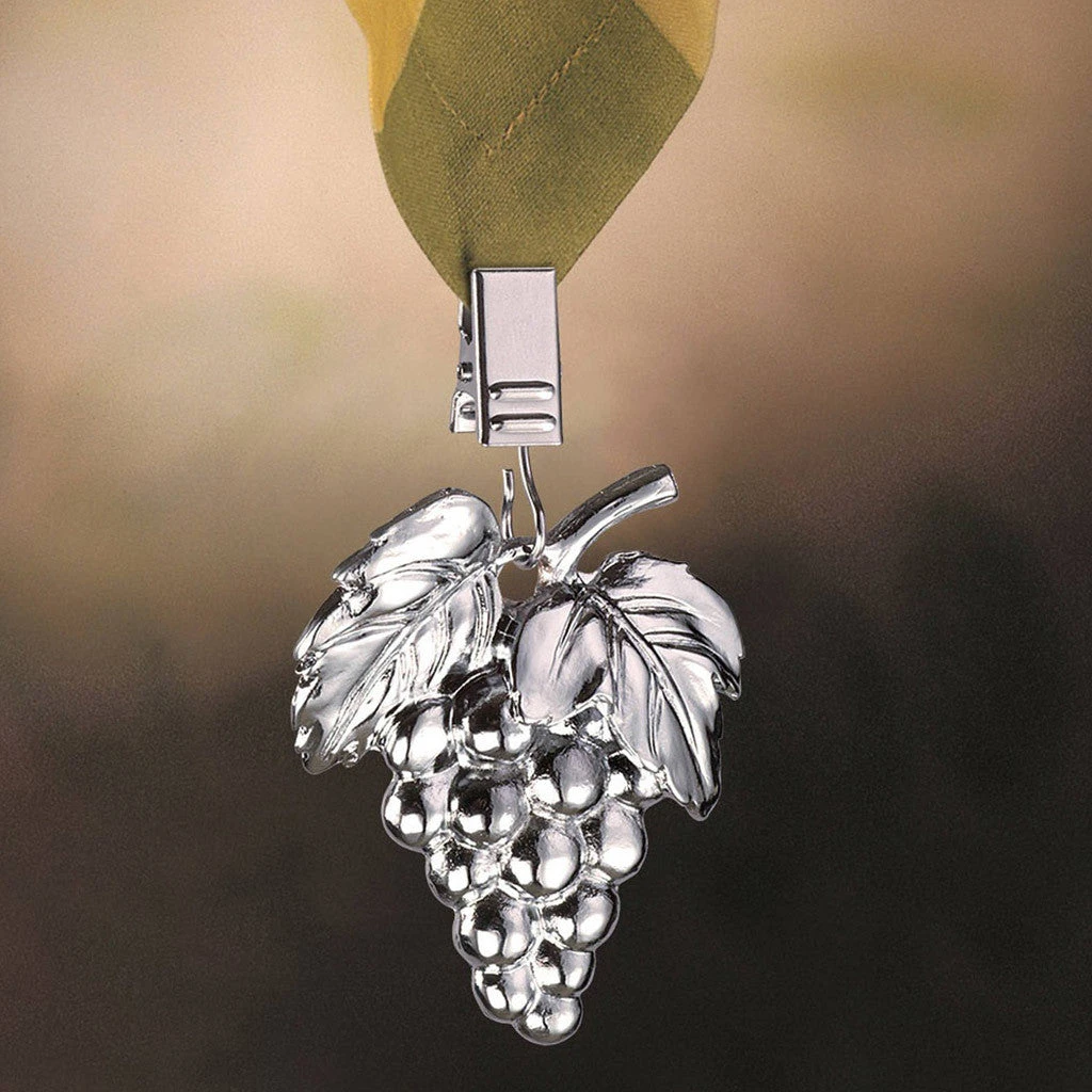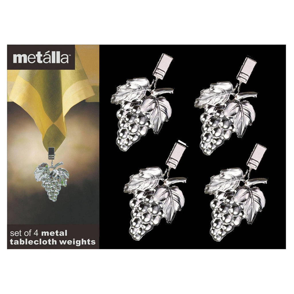 Attractive and functional, these chrome grapes tablecloth weights are a must for all outdoor entertaining. Simply clip each weight around the bottom of your tablecloth to keep it from blowing in the wind. Sold as a set of 4 . Packaged in an attractive box with clear sleeve. Made in Taiwan.